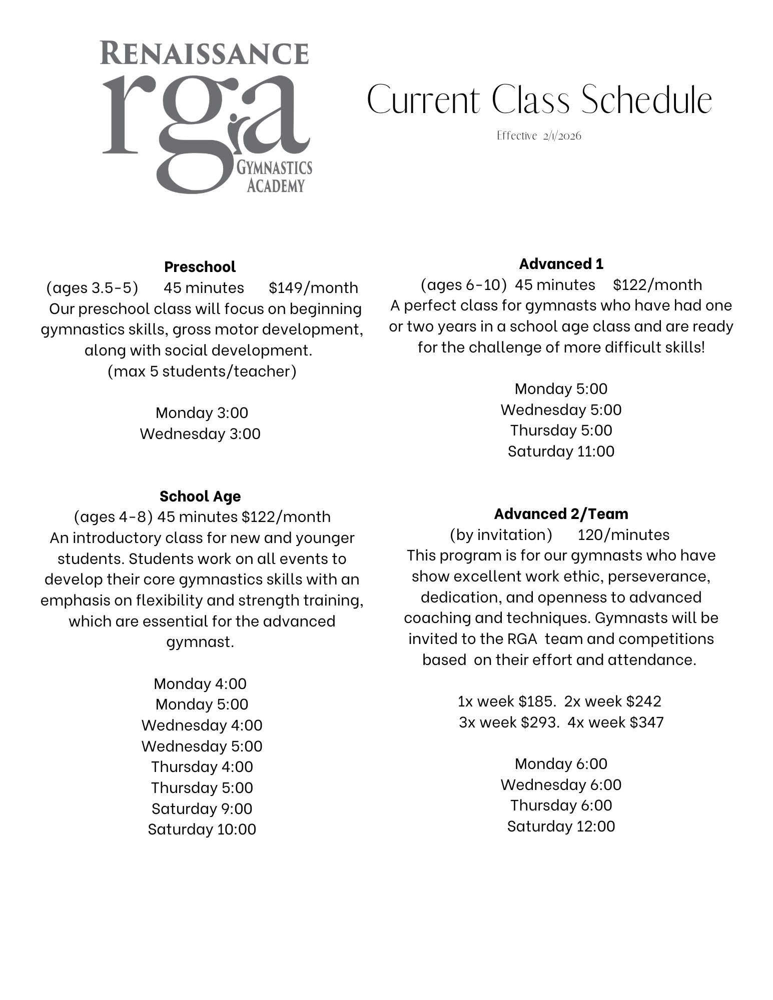 Gymnasts may attend any class of their same level (Preschool, School Age, Advanced 1, Advanced 2, Team)